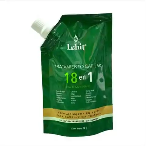 TRATAMIENTO LEHIT 18 EN 1 90 G : Repolarizador en frío para cabello maltratado, sin sal, sin parabenos, sin sulfatos. Para procesos de repolarización cosmética con aplicación en frío, que se realiza para lograr efectos acondicionamiento en el cabello. nutre e hidrata profundamente cabellos maltratados, secos, o con puntas abiertas. Contiene más de 18 ingredientes como queratina, ácido hialurónico y extractos naturales que ayudan a fortalecer la fibra capilar, controlar el frizz, devolver el brillo y la suavidad, y promover un crecimiento saludable del cabello. Para qué sirve específicamente: Reparar y fortalecer: Ayuda a reparar la fibra capilar dañada desde el interior. Hidratar: Proporciona una hidratación profunda y sella la cutícula. Nutre: Aporta un alto contenido de nutrientes y vitaminas para un cabello saludable. Revitaliza: Devuelve el brillo, la vitalidad y la suavidad al cabello. Controlar el frizz: Ayuda a controlar el encrespamiento y mejora la manejabilidad. Protege el cabello de daños futuros y factores ambientales. Promover el crecimiento: Favorece un crecimiento saludable del cabello. Principales beneficios: Contiene una potente mezcla de ingredientes activos, incluyendo proteínas y vitaminas. Es ideal para procesos de repolarización cosmética. Es un tratamiento repolarizador en frío. Está libre de sal, parabenos y sulfatos.