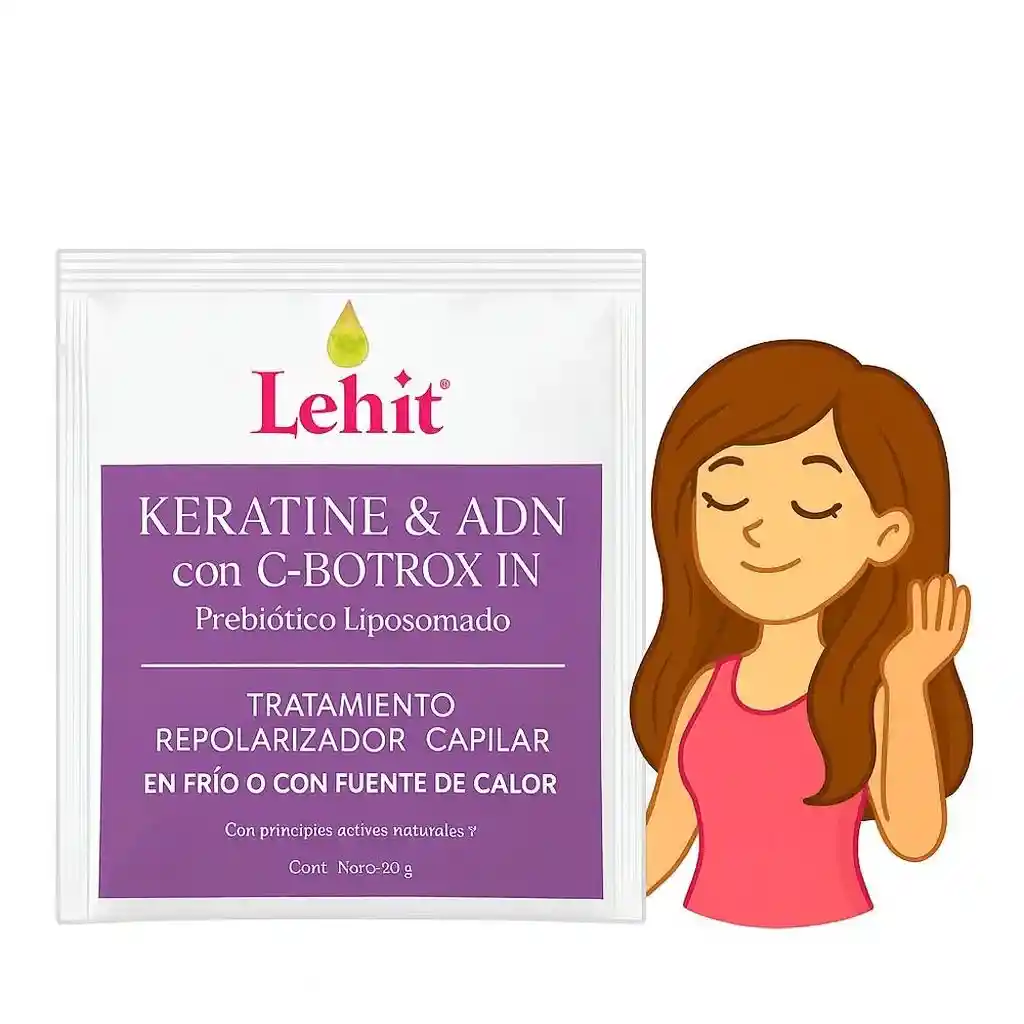 Descripción del Producto Nombre completo: Lehit Keratine & ADN con C-BOTROX IN Presentación: Sobre de 30 gramos Tipo: Tratamiento repolarizador capilar Modo de uso: Puede aplicarse en frío o con fuente de calor (secador o plancha). 🌿 Ingredientes y tecnología Keratina y ADN: Ayudan a reconstruir la fibra capilar, aportando fuerza y brillo. C-BOTROX IN: Componente que actúa como un “botox capilar”, suavizando y rejuveneciendo el cabello. Prebiótico liposomado: Mejora la salud del cuero cabelludo y protege la microbiota capilar. Principios activos naturales: No contiene sal ni parabenos, ideal para cabellos tratados químicamente. 💆♀️ Beneficios Repara el cabello dañado por tintes o alisados. Aporta brillo, suavidad y manejabilidad. Reduce el frizz y las puntas abiertas. Fortalece la hebra capilar y mejora la apariencia general del cabello. Ideal para uso profesional o en casa. ⚙️ Modo de aplicación Lavar el cabello con shampoo sin sal. Retirar el exceso de agua. Aplicar el tratamiento de medios a puntas. Dejar actuar de 15 a 20 minutos. Enjuagar con abundante agua.