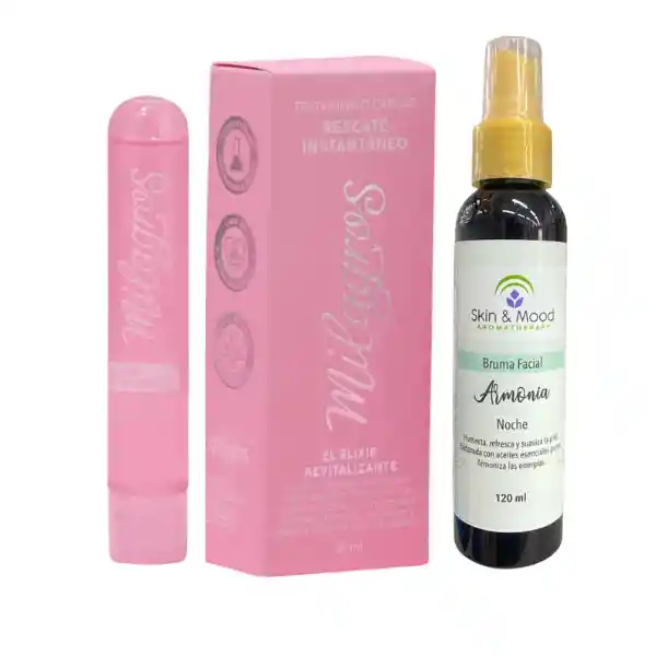 Kit de tratamiento rescate instantáneo y bruma facial noche armonía aromaterapia para el cuidado del cabello y el rostro. Tratamiento Rescate Instantáneo: Tratamiento con acido hialuronico, aminoacidos y complejo reparador ideal para cabellos dañados, decolorados, tinturados y/o alisados. Brinda al cabello brillo, suavidad, fortalecimiento, sedosidad y vitalidad. Bruma Noche Armonía: Bruma facial ideal para la noche elaborada con aceites esenciales puros que ayudan a armonizar las energías, calma, serena y aquieta el espíritu. Así mismo humecta, refresca, tonifica, nutre, cicatriza y suaviza la piel, previene el envejecimiento y controla la grasa. Ideal para todo tipo de piel. NO SE RECOMIENDA EL USO EN MUJERES EMBARAZADAS