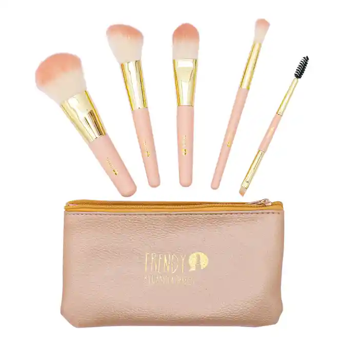Es un kit básico con 5 brochas tamaño pequeño, perfectas para viajar. Contiene 5 brochas, 1 para polvos,1 en forma angular para contorno, 1 brocha lengua de gato para productos en crema, 1 brocha difuminadora y 1 brocha dual con cepillo y angular pequeña para las cejas. Incluye cosmetiquera. Trendy no testea en animales. Recomendaciones Utiliza las brochas siempre según su función, cuando quieras difuminar un producto en los ojos hazlo con movimientos circulares o de parabrisas y en el rostro siempre a toques, no arrastres el producto ya que esto lo retirará y disminuirá su cobertura. Si tus brochas son de uso personal lávalas y desinféctalas cada 15 días con el Shampoo Brochas Trendy. Para hacer limpiezas más rápidas y de uso inmediato usa el Líquido Limpia Brochas para productos en polvo. Para aplicar tu base puedes usar la brocha lengua de gato y para darle un mejor acabado usa la Trendy Esponja a toques.