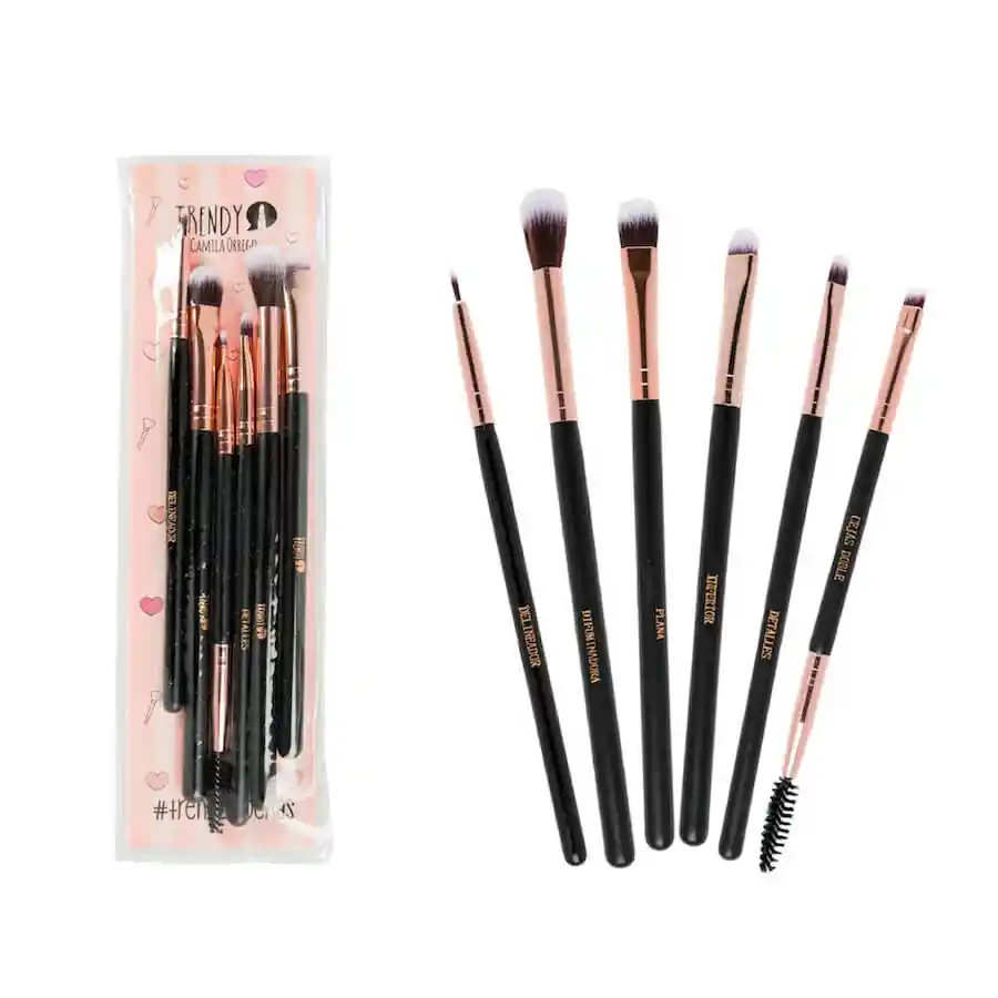 Es un kit básico infaltable para un maquillaje de ojos. Contiene 6 brochas de pelo sintético. Incluye1 brocha dual para cejas, 1 brocha para delineador, 1 brocha difuminadora grande, 1 brocha plana pequeña para cortes, 1 brocha plana grande para depositar producto y 1 brocha en punta para precisión.