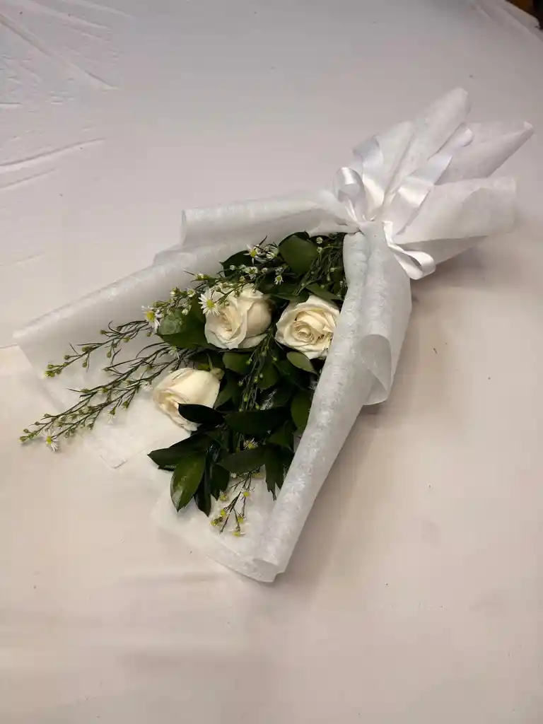 Tres rosas blancas organizadas con rusco y after blanco