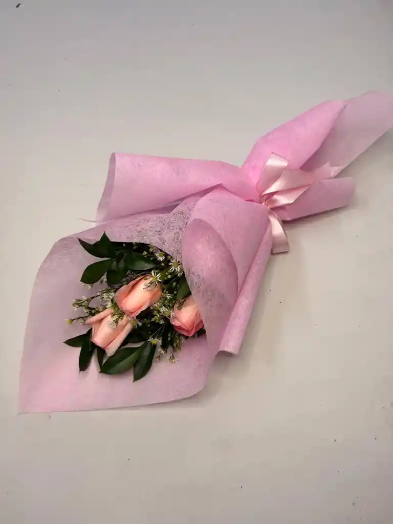 Tres rosas rosadas organizadas con rusco y eucalipto
