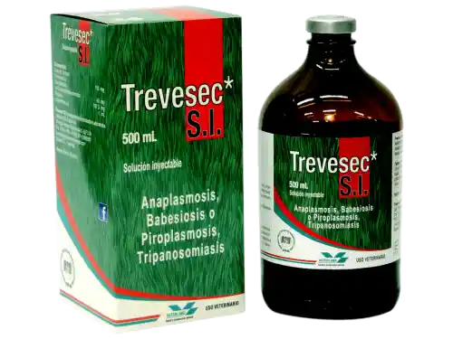 TREVESEC SOLUCIÓN INYECTABLE. Especies: Bovinos, Caninos, Equinos, Porcinos. INDICACIONES: Está indicado en bovinos, ovinos, equinos y caninos, en el tratamiento de las enfermedades hemoparasitarias, tales como: Anaplasmosis (Anaplasma sp.), Babesiosis (Babesia bigémina, Babesia bovis, Babesia canis) y Tripanosomiasis (Tripanosoma evansi, Trypanosoma vivax). Trevesec* controla las infestaciones específicas o mixtas causadas por hematozoarios; además de disminuir o controlar la fiebre que se presenta en estas enfermedades, las cuales son transmitidas especialmente por garrapatas.