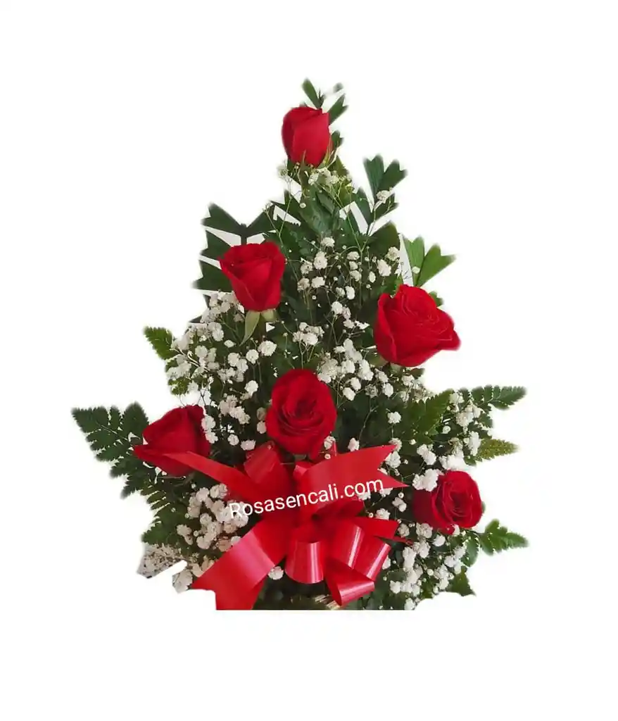 Arreglo floral elaborado con 6 rosas (color a elección), moño, fino follaje y tarjeta con mensaje