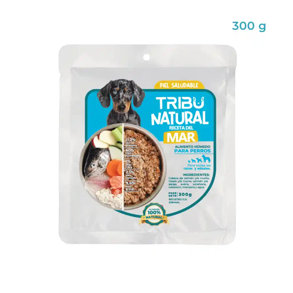 Nuestro nuevo alimento Tribu Natural es fabricado a partir de tecnología avanzada para ofrecerles un alimento premium que no requiere refrigeración ni conservantes, es 100% natural, húmedo y fresco, con un alto aporte de proteína de origen animal que tu peludito va amar. Recomendado: para perros de todas las edades a partir de los 2 o 3 meses. Ingredientes: Cabeza de salmón y/o trucha, tilapia y/o trucha, salmón y/o pargo, avena, zanahoria, calabacín, manzana y agua. 11.2% mínimo de proteína. 60% máximo de humedad. 1% máximo de fibra. 2.1% máximo de ceniza. 9.4% mínimo de grasas. 197 kcal/100 g
