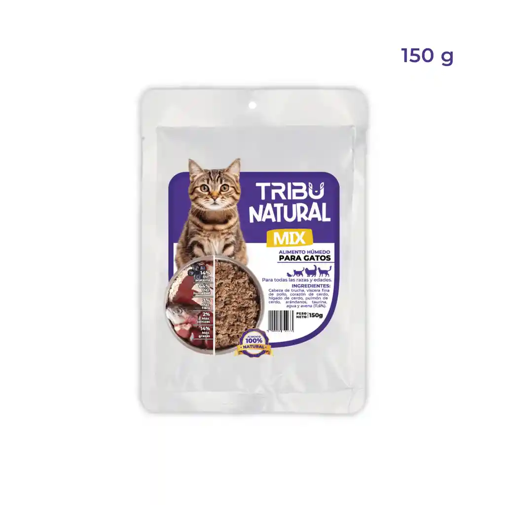 Nuestro nuevo alimento Tribu natural para Gatos cocido al vapor es fabricado a partir de tecnología avanzada para ofrecerles un alimento premium que no requiere refrigeración ni conservantes, es 100% natural, húmedo y fresco, con un alto aporte de proteína de origen animal que tu gatito va amar. Recomendado: para gatos de todas las razas y edades a partir de los 2 o 3 meses. Ingredientes: Cabeza de trucha, víscera fina de pollo, corazón de cerdo, pulmón de cerdo, hígado de cerdo, arándanos, taurina, agua y avena.. Información nutricional: 14% mínimo de proteína 64% máximo de humedad 3% máximo de fibra 2% máxima de cenizas 14% máximo de grasas 200 kcal/100 g