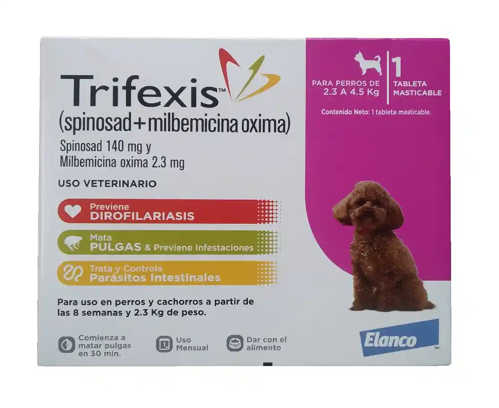 Masticable Con Delicioso Sabor a Carne de Res. Comienza su efecto entre los 30 minutos después de la aplicación eliminando parásitos internos (Ascálidos, Dirofilaria, Anquilostomas, Tricuridos) y externos (Pulgas, Garrapatas, Ácaros, Sarna), con un tiempo de duración de 30 Días.