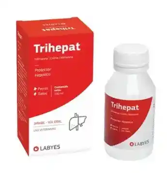 Trihepat (laboratorio Labyes) es un protector y regenerador hepático natural para perros y gatos, formulado con silimarina, colina y metionina. Ayuda a tratar hepatopatías, hígado graso, intoxicaciones y disfunciones gastrointestinales, mejorando la función del sistema retículo endotelial y biliar