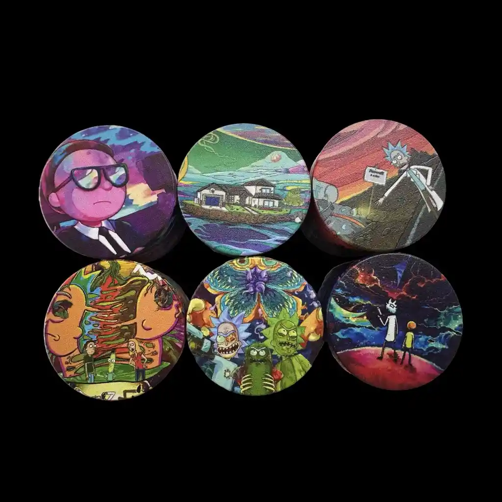 Trillador de 4 pisos con espectaculares diseños unicos de rick and morty! Medidas: Ancho 3.5 Alto 4 cm UNA UNIDAD DISPONIBLE