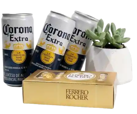 Un regalo perfecto para sorprender con estilo que combina tres cervezas Corona Extra, chocolates Ferrero Rocher y una suculenta natural en maceta decorativa, ideal para celebrar, compartir o regalar en momentos especiales el color de la maceta y la variedad de la suculenta pueden variar según disponibilidad, haciendo cada detalle único.