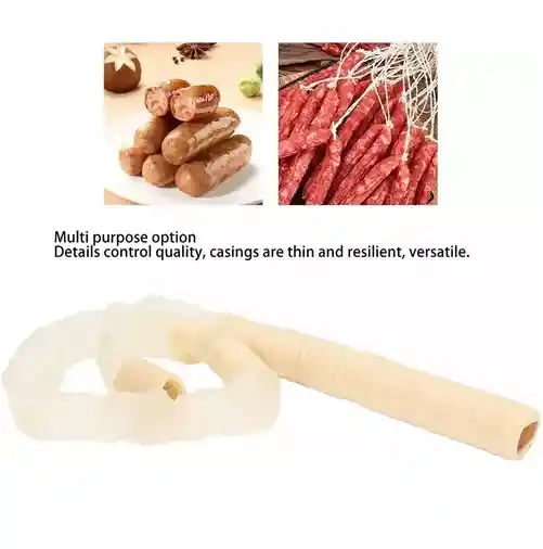 Recibes 1 tubo por 15 metros de tripa sintetica de colageno Calibre 26 Funda o tripa de colágeno, comestible y permeable (permite ahumado) con aplicación para la fabricación de embutidos. - 15 metros de longitud por tubo - Material colageno comestible -Chorizo, Longaniza, Rellena. Para tener en cuenta: Se trata de una tripa que no requiere remojo (si se remojan acaban deshaciéndose). A cambio, no requieren lavado previo y son perfectamente regulares al no tener las imperfecciones propias de las tripas naturales. Con esta tripa se logra un chorizo mas parejo lo que se refleja en un ahorro de carne.