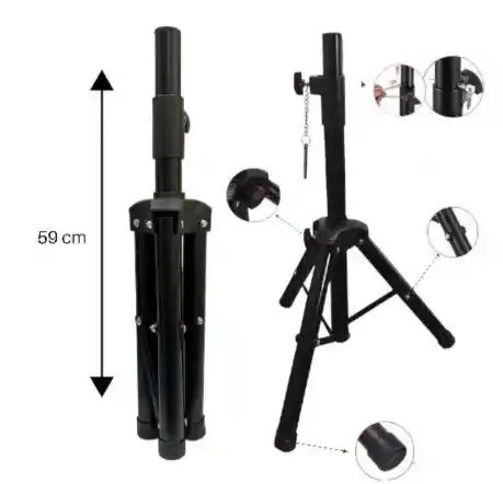 Un trípode de cabina es un soporte de tres patas diseñado para proporcionar estabilidad a equipos en eventos, ya sea una cámara en una cabina de fotos (photo booth) o un altavoz (cabina de sonido). Para Cabinas de Sonido / Altavoces Función principal: Sostener y elevar altavoces o bafles para optimizar la dispersión del sonido en un área. Materiales: Fabricados usualmente con una estructura de tubo metálico resistente y uniones de plástico ABS para garantizar durabilidad y ligereza. Ajustabilidad: Ofrecen altura regulable, a menudo desde 60 cm hasta 120 cm, o incluso 1.8 metros, para adaptarse a diferentes necesidades de ubicación. Estabilidad: Cuentan con una base reforzada y patas extensibles que se anclan al suelo, a veces con pasadores de seguridad y perillas de tensión para fijar la altura de forma segura.