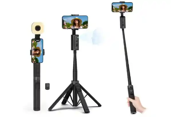 Cuatro seguimiento controlado por gestos: no requiere aplicación; el trípode de seguimiento facial para iPhone cuenta con seguimiento facial automático avanzado de 360°; simplemente desbloquea el interruptor en la parte posterior, y reconocerá automáticamente y se bloqueará en tu cara; "[OK]" para iniciar el seguimiento, "[PALM]" para pausar, "[V]" para bloquear la cara, "[Pulgar hacia arriba]" para detener el control de gestos; ideal para grabación de video manos libres Seguimiento de IA de cuarta generación: el trípode que sigue tu movimiento está equipado con una cámara AI incorporada con el último motor de sensor inteligente AR, por lo que puede rastrear automáticamente y bloquear con precisión en tu cara, asegurando que te mantengas enfocado en cada toma; la cámara solo se utiliza para seguimiento facial de IA, no para grabar Trípode de cuatro patas con estabilidad mejorada: el trípode inteligente de reconocimiento facial AI para smartphone es duradero y resistente, ya que está hecho de aleación de aluminio con patas extendidas, esqueleto similar a un paraguas y soporte de cuatro puntos; ideal para mejorar la estabilidad excepcional durante la grabación de video o el uso del trípode alto; Además, el trípode de seguimiento facial automático de rotación 360 con soporte está equipado con una batería recargable incorporada de 1000mAh que dura hasta 5.5-6 horas de trabajo después de la carga completa ; Las horas de carga para el trípode del reconocimiento facial son 1.5-2 horas Palillo selfie integrado 4 en 1 y trípode: el trípode giratorio 360 selfie stick puede extenderse hasta 57 pulgadas y colapsar hasta 12.2 pulgadas ya que la revolucionaria construcción integrada se adopta para eliminar las juntas sueltas mientras mantiene la portabilidad, asegurando la conversión del trípode en palo selfie, trípode de escritorio, trípode de tierra y estabilizador de mano. Además, el soporte del teléfono se extiende 2 -4 pulgadas de ancho para sujetar de forma segura la mayoría de los teléfonos inteligentes con tamaños de pantalla de 4 a 7 pulgadas Asistente portátil de creación de contenido de fotos de video: el trípode móvil para grabación de video es compatible con TikTok, YouTube, Instagram, Facebook, Zoom y aplicaciones de transmisión en vivo para un funcionamiento perfecto, por lo que es ideal para viajes o fotografía al aire libre, selfies de viaje, fotos grupales y uso versátil; Además, el trípode de seguimiento de movimiento incluye un anillo pequeño extraíble y giratorio 360 con 3 modos de color (cálido, fresco, natural) y 3 Niveles de brillo para cada uno modo, ideal para mejorar la iluminación óptima de fotos y videos en condiciones de poca luz Control remoto Bluetooth para grabación de video TikTok: el trípode extensible para iPhone con luz viene con un control remoto Bluetooth recargable, lo que le permite administrar fácilmente TikTok desde lejos sin necesidad de deslizar su pantalla. El control remoto recargable permite la navegación sin pantalla de TikTok (funciones de desplazamiento/deslizamiento/similar), mejorando la captura de video y la comodidad de visualización