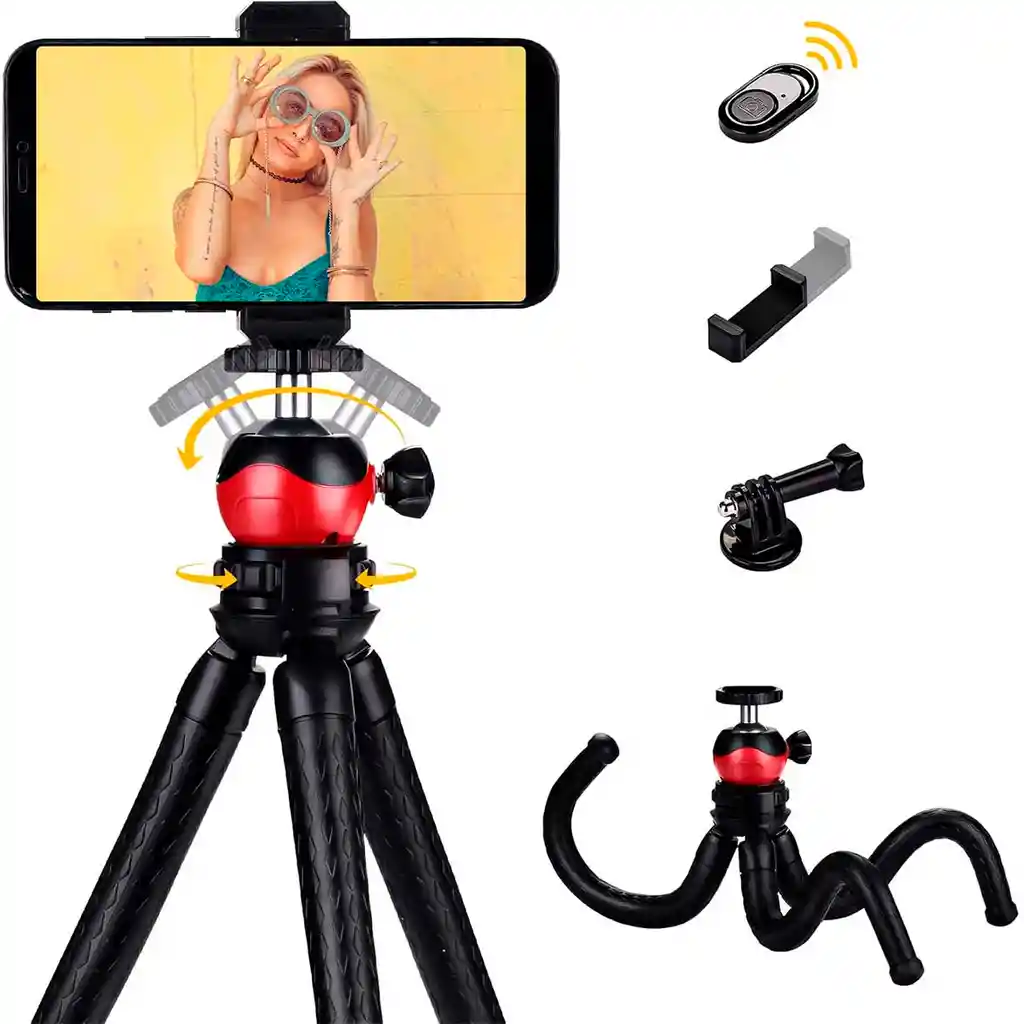 El Trípode Flexible Portátil con Control Remoto Inalámbrico es la herramienta perfecta para quienes buscan una experiencia de grabación y fotografía sin complicaciones. Con su capacidad de rotación de 360°, puedes ajustar fácilmente el ángulo de tu dispositivo, ya sea un iPhone, Android, GoPro, iPad o cámara DSLR, asegurando una toma perfecta desde cualquier posición. Su diseño flexible permite usarlo en cualquier superficie, mientras que el control remoto inalámbrico te ofrece comodidad y mayor libertad al capturar imágenes o videos. Ideal para vlogs, streaming, grabaciones de deportes, viajes y más, este trípode combina calidad, versatilidad y facilidad de uso, garantizando resultados profesionales sin importar tu nivel de experiencia.