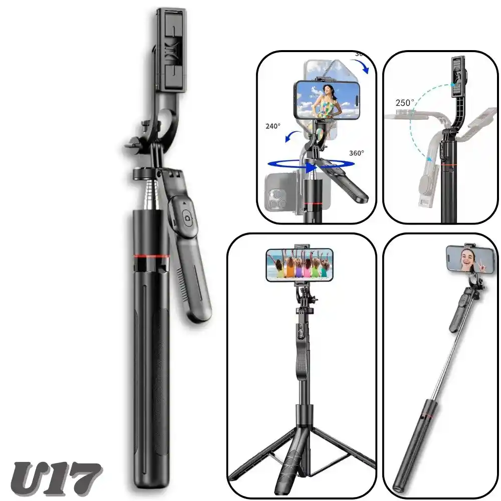 Tripode Monopod Palo De Selfie 3 En 1 Extensible 170Cm Control Bluetooth U17 ¡Olvídate de pedirle el favor a extraños para que te tomen una foto o de conformarte con malos ángulos! El Trípode Monopod U17 es el accesorio definitivo para llevar tus fotos, videos, transmisiones y contenido al nivel más profesional. Es tan versátil que será el único soporte que necesitarás. Características: -Toma el control del espacio: A diferencia de los palos selfie comunes que se quedan cortos, este modelo cuenta con un tubo telescópico reforzado que se extiende hasta unos impresionantes 170 cm. ¡Perfecto para capturar paisajes enteros, grupos grandes de personas o grabarte de cuerpo completo sin que nada quede por fuera del encuadre!. - Diseño 3 en 1:Se adapta exactamente a lo que necesites en el momento. Modo Palo Selfie: Agarre firme y cómodo, ideal para vlogs, viajes y tomas dinámicas en movimiento. Modo Trípode de Piso: Abre sus patas integradas para crear una base estable de piso. Perfecto para fotos grupales, fotos de modelaje o grabar coreografías. Modo Trípode de Mesa: Úsalo a baja altura en tu escritorio para videollamadas, clases virtuales, tutoriales de maquillaje o transmisiones en vivo (Lives). - Control Remoto Bluetooth: Incluye un pequeño disparador inalámbrico que se sincroniza rápidamente con tu celular (iOS o Android). Puedes alejarte del trípode, posar con calma y tomar la foto o iniciar la grabación de video con un solo clic. - El ángulo perfecto: Su pinza expansible sujeta tu teléfono de forma súper segura. Además, cuenta con un cabezal giratorio de 360 grados que te permite cambiar rápidamente entre formato Vertical y formato Horizontal, para tomar el control de tus vídeos - Multidispositivo: Su pinza sujeta firmemente cualquier teléfono celular. Además, la montura superior te permite colocar cámaras sin problema.