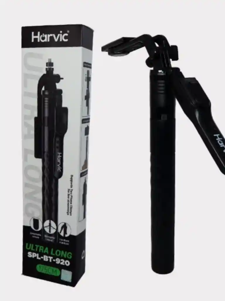 - Captura tus mejores momentos con total estabilidad y estilo. El Harvic SPL-BT-920 combina diseño ergonómico, control remoto inalámbrico y una estructura extensible que te permite lograr ángulos perfectos en cada toma. - Ideal para selfies, vlogs, grabaciones, videollamadas y transmisiones en vivo con máxima estabilidad y alcance. - Perfecto para creadores de contenido, influencers, viajeros y amantes de la fotografía móvil. - Soporte para 2 abrazaderas de teléfono. - Control Remoto Bluetooth: Extraíble, con botón de disparo integrado. - Luz para selfies con duración de aproximadamente 2 horas. - Rotación: Cabezal ajustable con ángulo de 360 grados. - Diseño Ergonómico: Mango texturizado para mejor agarre. - Portátil y Liviano: Ideal para llevar en viajes o uso diario. - Material: Plástico ABS de alta resistencia y aleación metálica. - Longitud Extensible: Hasta 1.75 cm. - Compatibilidad: Smartphones de hasta 6.5".