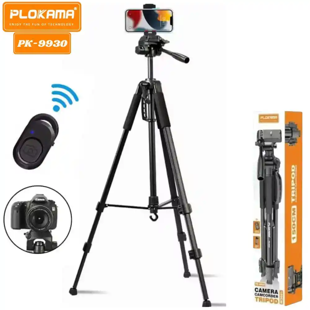 Tripode Soporte Adaptable Para Camara Y Celular Plokama Pk-9930 1.50mts Negro Trípode 360, fácil de usar y armar. Ofrece mayor facilidad de transporte y de uso para cualquier tipo de actividad fotográfica, grabaciones o cualquier otro tipo de contenido similar. - Cuenta con nivel de brújula incorporada para evitar inclinaciones no deseadas. - Pies de goma antideslizantes para mayor estabilidad en todo tipo de superficies. - Agarre ergonómico para ajustar la posición de la cabeza fácilmente. - Diseño ligero y plegable, perfecto para transportar en viajes. - Cuenta con un mando de control Bluetooth para capturar tus fotos y vídeos desde la distancia. CARACTERISTICAS - Modelo: Plokama Pk-9930 - Materiales: Aluminio con plástico ABS - Color: Negro - Soporta hasta: 2 kg - Trípode de aluminio para Cámara o Celular - Altura mínima: 49 cm - Altura máxima: 1.50