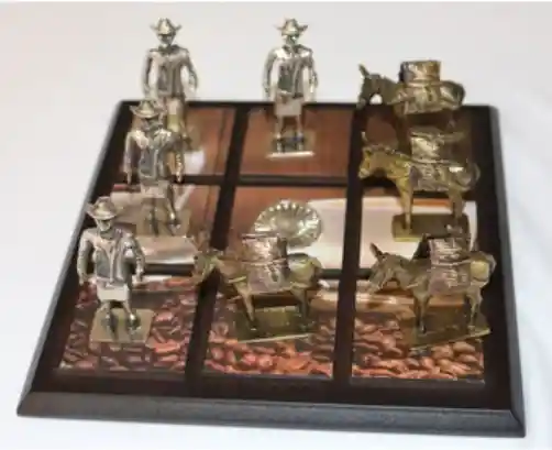 Juego de triqui (tres en línea o X/O), de cafeteros y mulitas de trabajo, tablero en MDF con mapa cafetero impreso en vinilo mate, Fichas metálicas doradas y plateadas envejecidas, para decoración y juego. Medidas Aproximadas.: Tablero Ancho: 20cm x largo 20cm x alto 1.5 cm; Fichas altura promedio 8,0cm x 1.8 cm de Ancho Peso Aproximado. : 800gr. Empaque: Caja de cartón rustica