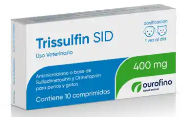 Trissulfin SID es una asociación entre Ormetoprim y Sulfadimetoxina; dos antimicrobianos de asociación sinérgica, con potencialización de la acción de la Sulfadimetoxina en consecuencia de la asociación al Ormetoprim. Es indicado para el tratamiento de infecciones bacterianas que afectan perros y gatos, causadas por los agentes Escherichia coli, Klebsiella pneumoniae, Proteus mirabilis, Proteus vulgaris, Staphylococcus aureus, Staphylococcus intermedius, Streptococcus pyogenes, Streptococcus zooepidermicus y Pasteurella multocida, y para el tratamiento de isosporosis en perros, causadas por los agentes Cystoisospora canis y Cystoisospora ohioensis. Algunas enfermedades que afectan perros y gatos, generalmente asociadas a microorganismos sensibles al Trissulfin SID, están presentadas en la tabla en lo inserto. Modo de Uso y Dosis: Infecciones bacterianas - Administrar el producto por vía oral, con intervalos de 24 horas en una dosis inicial de 160 mg/kg de peso corporal (dosis de ataque) en el primer día de tratamiento. Para los días subsecuentes, administrar la dosis de 80 mg/kg de peso corporal. El tratamiento debe ser realizado por un mínimo de 3 (tres) días, siendo el primer día con la dosis de ataque y los otros con la mitad de esa dosis. Sugerimos la continuidad del tratamiento por al menos 2 (dos) días tras la remisión de las manifestaciones clínicas, sin extenderlo por más de 21 días consecutivos. Isosporosis - Administrar el producto por vía oral, con intervalos de 24 horas, en la dosis de 200 mg/kg de peso corporal. El tratamiento debe ser realizado por al menos 5 (cinco) días y continuado hasta la remisión de las manifestaciones clínicas (diarrea) y el fin de la eliminación de ooquistes por los excrementos, sin que el tratamiento pase de 14 días consecutivos. En estudio realizado en perros con isosporosis, el producto Trissulfin SID demostró eficacia del 100% en todos los animales tratados, a partir del quinto día de tratamiento, cesando la diarrea y bajando a cero el conteo de ooquistes en el examen de laboratorio de OPG.