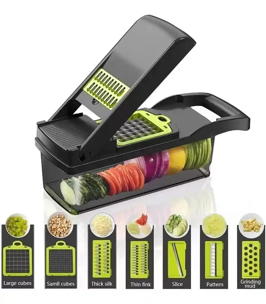 Herramientas Multifuncionales 7 en 1 PLUS: Cambia las cuchillas y presiona para cortar diferentes verduras o frutas, muy fácil de operar, te ayuda a cocinar mejor y más rápido. DESCRIPCIÓN Herramientas creativas multifuncionales de frutas vegetales con 7 tipos de cuchillas, perfectas para trituradora, ricer, picadora, cortadora, trituradora, rebanadora. Tu ayudante de cocina ideal, por el cual ya no tendrás inconvenientes al momento de cocinar, el conjunto de cuchillas multifuncionales en acero inoxidable tiene todo lo necesario para cortar, rebanar y rallar. Picar las cebollas, calabacines, pimientos, apio, tomates, huevos duros, queso, frutas y luego ver como la transferencia de ingredientes pasa instantáneamente a la superficie de corte al recipiente de abajo. No hay problemas, y sin ensuciar, más agradable con el Plus ya no es un problema, ya que tiene todo en un sistema práctico, sencillo y ahorro de espacio como se pone. CARACTERÍSTICAS * Herramienta multifuncional con 7 cuchillas. * Tritura, ralla, pica y corta fácilmente. * Fabricado en acero inoxidable duradero. * Ideal para una variedad de ingredientes. * Fácil de usar y limpiar. * Transferencia directa de ingredientes. * Diseño práctico y compacto. * Minimiza el desorden en la cocina. * Ahorra espacio de almacenamiento. * Eficiente y versátil en la preparación de alimentos. MEDIDAS Largo: 10 cm Alto: 12 cm Ancho: 28,5 cm Peso: 515 g QUE INCLUYE LA COMPRA X1 Cortador Frutas Vegetales 7 en 1