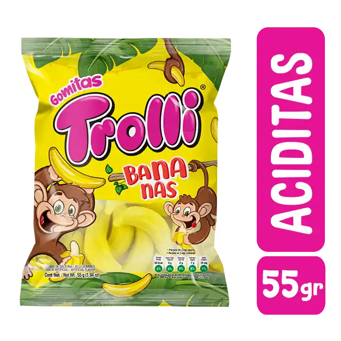 Trolli. deliciosas gomitas de grenetina con divertida forma de bananas de sacor acido.