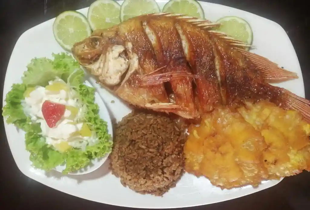 Arroz de coco o blanco, trucha, ensalada, patacones y jugo.