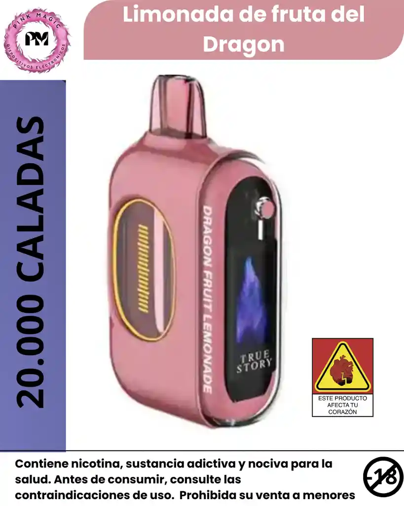 Dragon Fruit Lemonade: Limonada de fruta del dragon con un toque fresco Descubre el vape desechable True Story de 20.000 puffs! un innovador vape que cuenta con un tanque ultra transparente que permite ver directamente la esencia, además de una pantalla HD animada. Cada vape viene cargado con 20 Ml de esencia y una robusta batería recargable con puerto tipo C de 700Mah de capacidad. El vape desechable True Story de 20.000 puffs está diseñado pensando en tu comodidad al ofrecer la posibilidad de ajustar su potencia de 3 modos: A para 20.000 puffs, Además, cuenta con resistencias de doble malla para mejorar la producción de vapor y sabor.