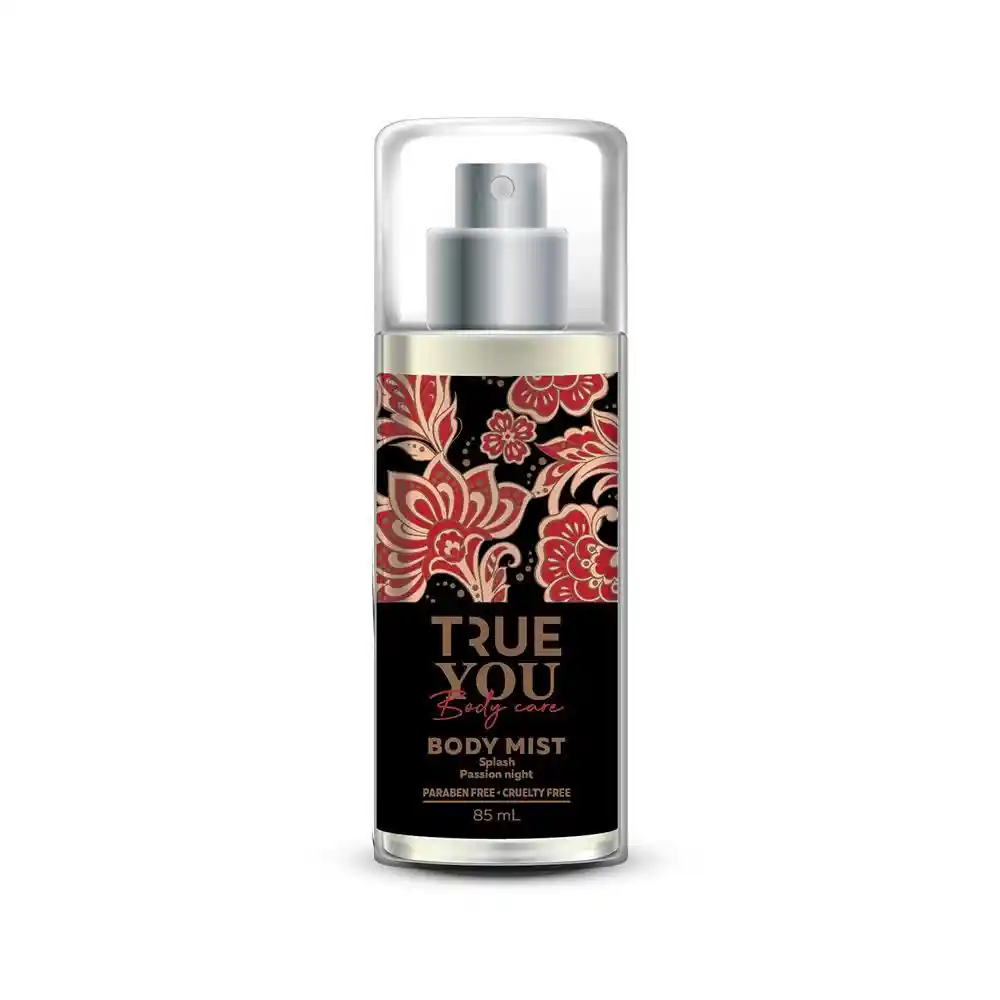 ¡Refresca tu piel con True You! El Splash Corporal True You Passion Night de fragancia Floral-frutal con toque oriental, ideal para una mujer sensual, romántica y divertida. Este spray corporal deja tu piel con un suave y delicioso aroma. Además, este splash para el cuerpo refresca e hidrata la piel. Contiene: 240ML