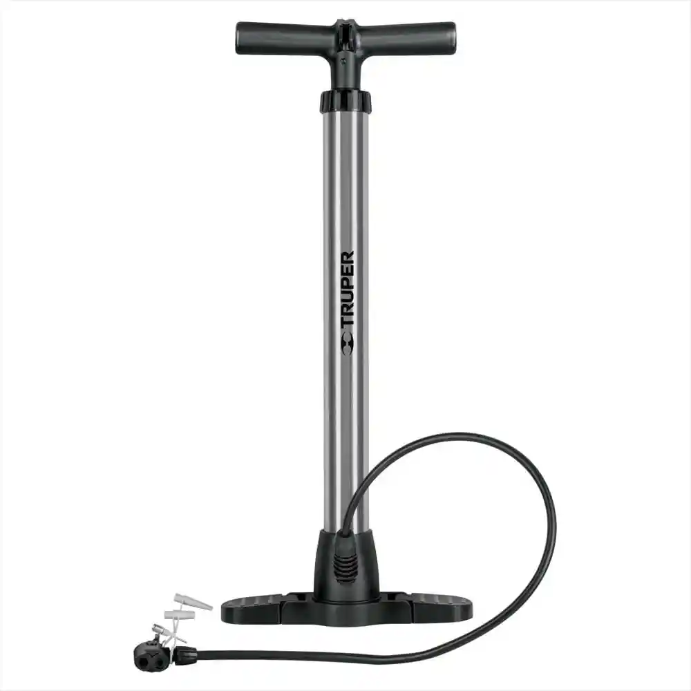 Cilindro Fabricado dn Acero Manguera de Hule y Válvula Plástica Mango y Base de Polipropileno Base Con Pedal Abatible Para un Mayor Apoyo. Incluye Válvula Para Balones Válvula Para Inflables Adaptador Para Válvula Tipo Presta y Schrader