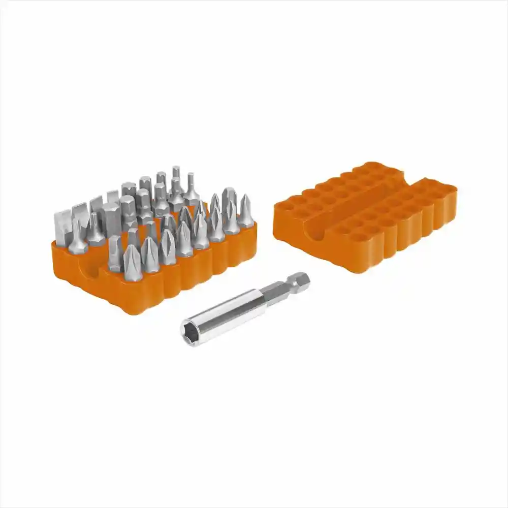 Set Contiene 33 Unidades. Puntas; Largo 1". Fabricadas en Acero al Cromo Vanadio 2x Más Resistentes al Desgaste Que Las de Acero al Carbono. Pueden Usarse Con Taladro; Desarmador Eléctrico o Manual. Organizador Plástico