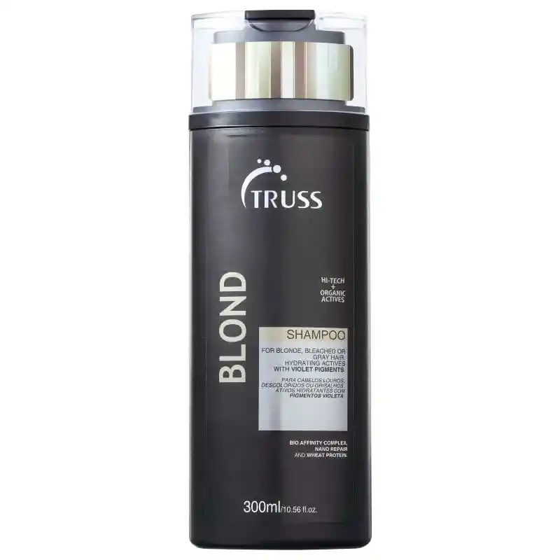 Truss Shampo Blond 300ml Shampo especial con mezclablend de pigmentos violeta para neutralizar tonos anaranjados en cabellos rubios y decolorados y tonos amarillentos en cabellos canosos. Recupera la fuerza, resistencia y flexibilidad natural de las hebras de cabello, dejándolas más suaves y brillantes. Con pH fisiológico y sin agregado de sal, es ideal para el uso diario y protección del color. Beneficios Humecta Revitaliza Suavidad Da flexibilidad Protección de color Modo de uso Aplique, masajee suavemente, deje actuar 2 minutos y enjuague. Repita.