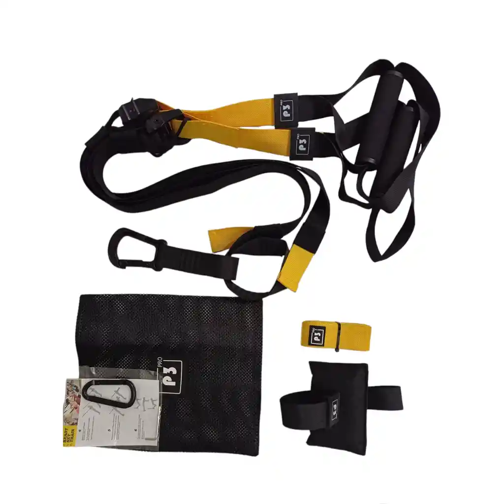 Accesorios para hacer rutinas de ejercicios en cualquier parte ya sea aire libre o la comodidad de tu casa. - Set de bandas de suspensión de alta calidad. - Sistema de anclaje único con mosquetones metálicos para tu seguridad. - Bucle de bloqueo que maximiza tu entrenamiento evitando deslizamientos. - Agarres texturizados para mayor comodidad. - Correas y costuras de grado militar que aseguran su durabilidad y resistencia. GARANTIA: Todos nuestros productos son revisados antes de ser enviados. Sin embargo, recomendamos que tan pronto lo recibas, verifiques que está en perfectas condiciones.