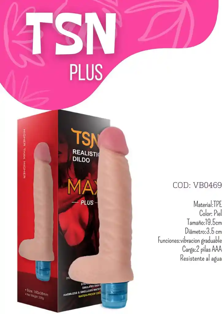 MATERIAL: TPE COLOR: PIEL TAMAÑO: 19.5cm DIAMETRO: 3.5cm FUNCIONES: Vibración Graduable CARGA: 2 pilas AAA RESISTENTE AL AGUA