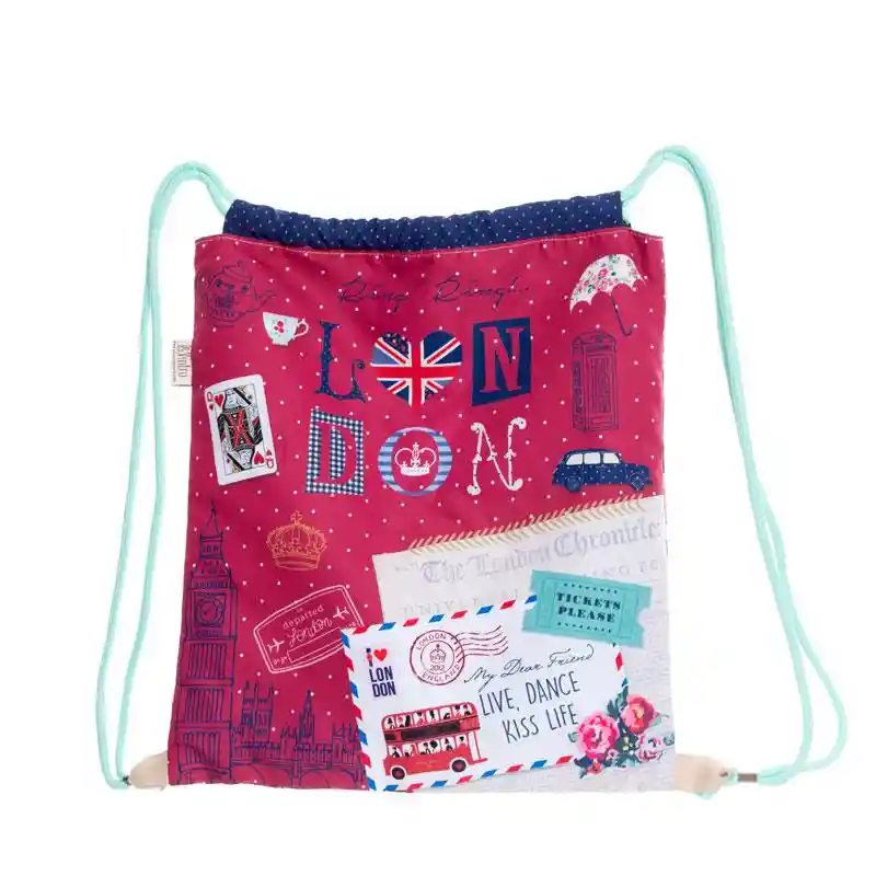 Tula estampada en la parte frontal y posterior en la colección London. con cargadera color verde. Interior en tela antifluido. Bolsillo en la parte interna.34 cm ancho x 39 cm alto