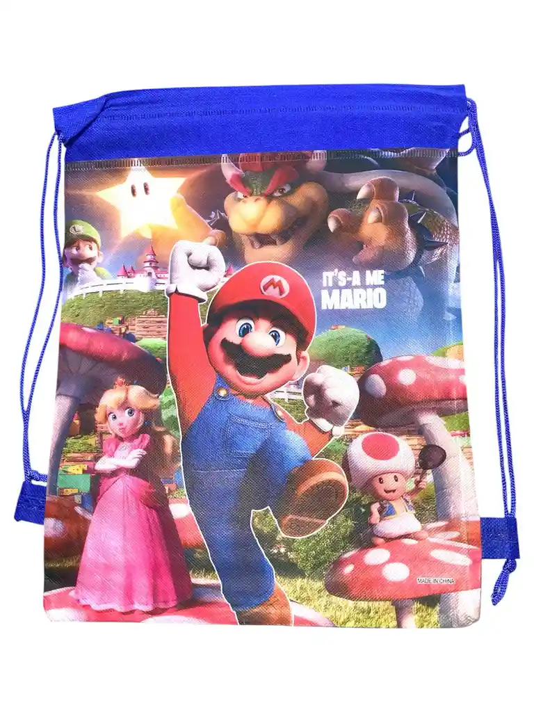 tulas (mochilas de cordón) con diferentes diseños coloridos y llamativos, inspirados en personajes populares de películas, series animadas y temas infantiles, Cada tula tiene un diseño vibrante con cordones ajustables, ideales para niños y niñas que buscan llevar sus pertenencias con estilo.