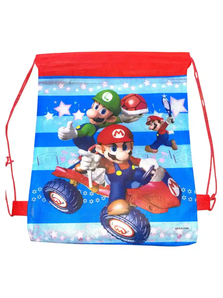tulas (mochilas de cordón) con diferentes diseños coloridos y llamativos, inspirados en personajes populares de películas, series animadas y temas infantiles, Cada tula tiene un diseño vibrante con cordones ajustables, ideales para niños y niñas que buscan llevar sus pertenencias con estilo.
