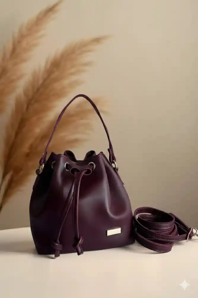 MEDIDAS: Alto:18cm Largo:20cm Ancho:13cm Descripción: El bolso es de estilo bucket bag (o tipo saco), caracterizado por su diseño estructurado pero flexible y un aire sofisticado. -Cierre: Utiliza un sistema de cordón ajustable que pasa a través de ojales metálicos, rematado con nudos decorativos en los extremos de las tiras. -Material: Presenta un acabado en cuero sintético o piel con una textura lisa y un ligero brillo satinado que resalta su calidad "luxury". -Asas: Posee un asa corta fija para llevarlo en la mano o al antebrazo, y viene acompañado de una correa larga ajustable y removible, diseñada para usarse al hombro o cruzada.