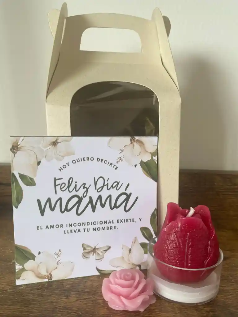 Vela de soya en forma de tulipan en base de soya aromatizada, en caja y tarjeta.