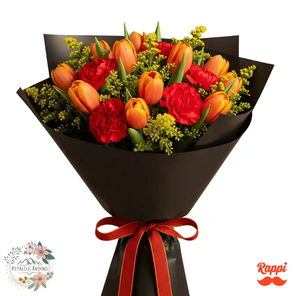 Un bouquet vibrante y lleno de energía donde los tulipanes naranjas destacan por su calidez y alegría, combinados con la intensidad de los claveles rojos que aportan carácter y profundidad. Los delicados follajes y detalles amarillos realzan la composición, creando un contraste armonioso y llamativo. Envuelto en un elegante papel negro con lazo rojo, este arreglo es perfecto para expresar pasión, entusiasmo y celebrar momentos especiales con un toque moderno y sofisticado.