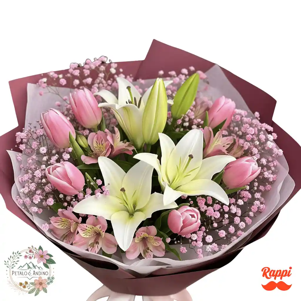 Un bouquet sofisticado y lleno de elegancia donde los tulipanes rosados aportan suavidad y romanticismo, acompañados por majestuosos lirios blancos que destacan por su belleza y presencia. Los delicados detalles de flores pequeñas y alstroemerias añaden textura y un toque encantador, creando una composición armoniosa y delicada. Envuelto en tonos sutiles con acabado moderno, este arreglo es ideal para expresar amor, admiración y sentimientos profundos en ocasiones especiales.