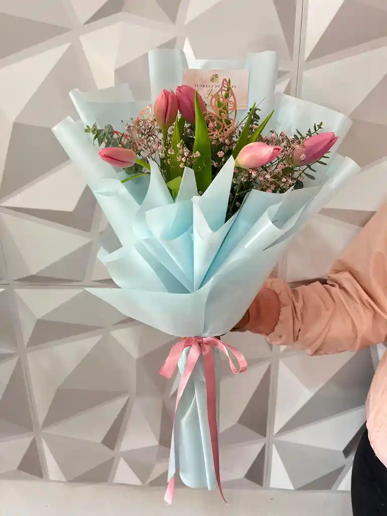 Bouquet de 5 tulipanes con follaje mixto, envoltura super especial en papel coreano, mariposas decorativas y tarjeta personalizada. *Color de tulipanes SEGUN DISPONIBILIDAD* *Color de papel coreano según disponibilidad*