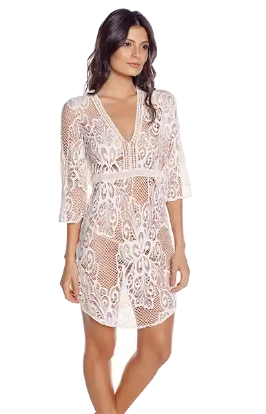 Cinto es una tunica de encaje. Tiene una espalda de escote en V profundo y sus mangas son 3|4