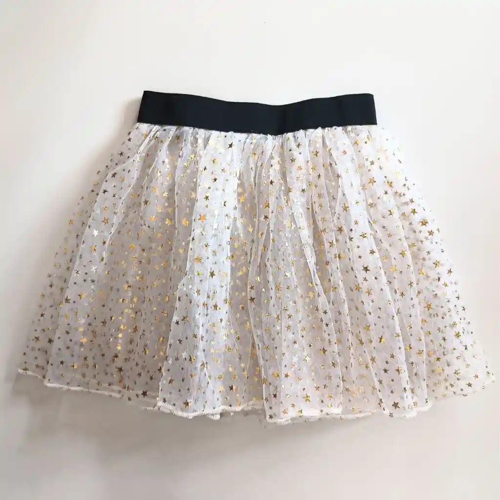 Tutú blanco con estrellas doradas, con elástico negro en la cintura. Ideal para disfraces!