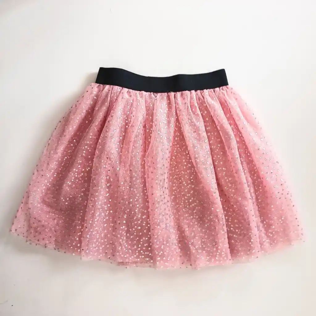 Tutú rosa con estrellas plateadas, con elástico negro en la cintura. Ideal para disfraces, para clases de baile o para jugar.