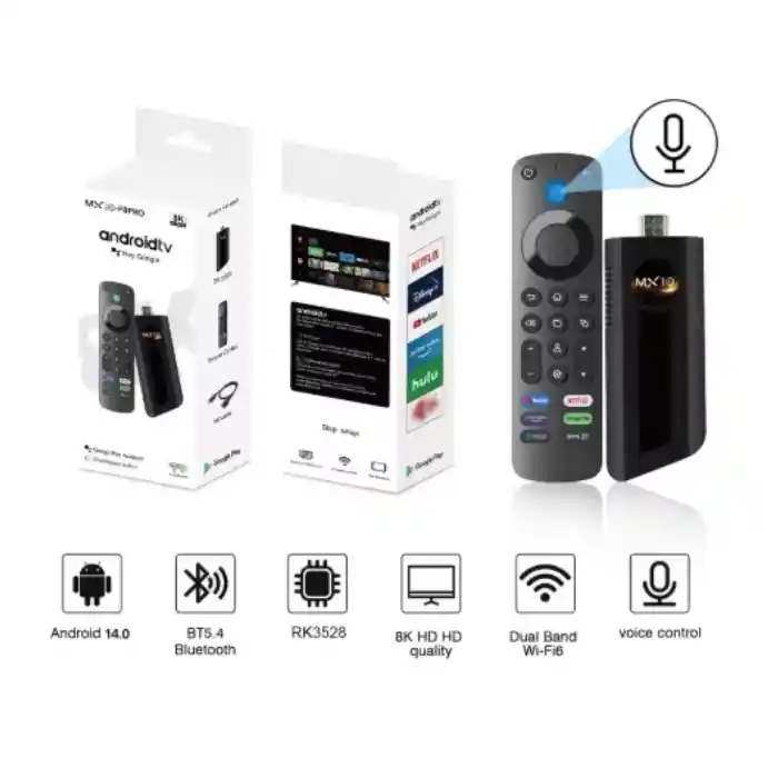 Transforma tu televisor en un centro de entretenimiento con el TV Stick MX10 F8 PROSmart. Este dispositivo compacto y fácil de usar se conecta a través de HDMI, permitiéndote disfrutar de tus aplicaciones favoritas en alta definición. Con su sistema operativo Android, el MX10 ofrece una interfaz intuitiva y acceso a una amplia variedad de contenido. Además, su control por voz integrado facilita la navegación, permitiéndote buscar y seleccionar programas sin complicaciones. Soporte para resolución de 8K, brindando una experiencia visual de alta definición y gran nivel de detalle.* Ideal para televisores, monitores y proyectores con puerto HDMI, este stick de streaming es perfecto para quienes buscan una experiencia de visualización mejorada. Conéctate a tu red Wi-Fi y comienza a disfrutar de tus series y películas preferidas en cuestión de minutos. No dejes pasar la oportunidad de llevar la experiencia de cine a tu hogar con el TV Stick MX10 F8 PRO Smart. Su diseño compacto y funcionalidad avanzada lo convierten en una opción ideal para cualquier amante del entretenimiento digital.