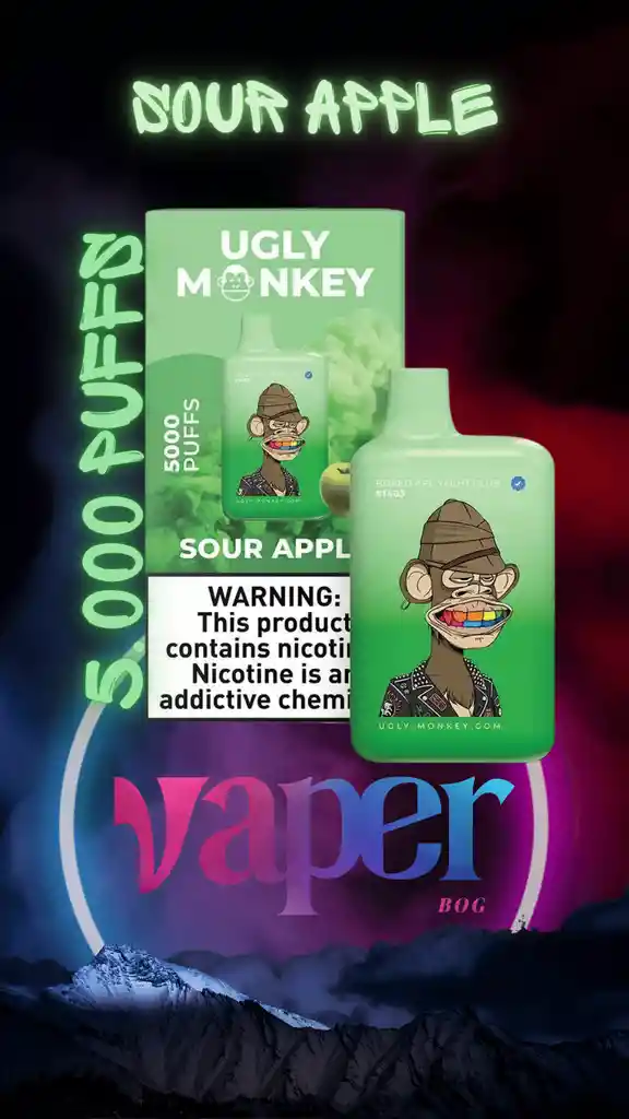 Ugly Monkey Sour Apple 5000 Puffs Prohibida la venta a menores de edad. Producto nocivo para la salud que contiene nicotina, sustancia altamente adictiva. Antes de consumir consulte las indicaciones y contraindicaciones de uso