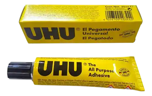 UHU PEGAMENTO UNIVERSAL es un pegamento líquido de resina sintética para pegados rápidos y transparentes en el hogar, en la oficina, en maquetería, manualidades, etc. UHU PEGAMENTO UNIVERSAL pega con rapidez y de forma duradera numerosos materiales. El pegado se puede regular a corto plazo. No arruga el papel. Universal - pega madera, materiales de carpintería, plásticos (ABS, PVC blando y duro, plexiglás®, poliestireno, Resopal®), metal, vidrio, porcelana, cerámica, cuero, goma, fieltro, corcho, tela, cartulina, papel,...No apropiado para styropor®, PE ni PP.