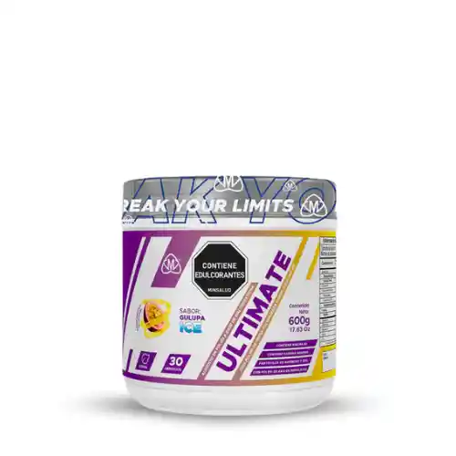 Ultimate es un alimento en polvo a base de maltodextrina con polvo de fresa pulverizada, con sabores a: green fusion, watermelon candy y gulupa ice. Consumir antes de cualquier actividad fisica y su consumo debe ser moderado.