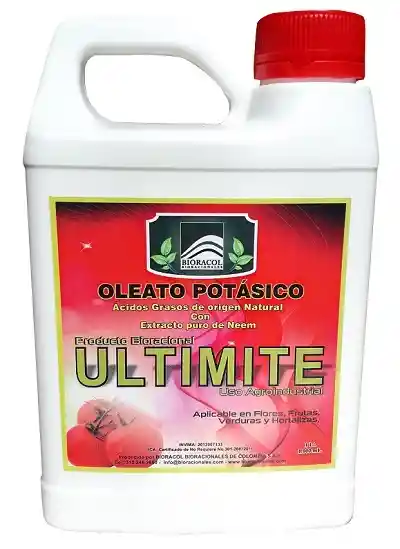 "ULTIMITE es una Emulsión Concentrada, formulada a partir de Ácidos Grasos de origen natural con Extracto puro de Neem, más tensoactivos y surfactantes que proporcionan características destacadas de aplicabilidad a un producto Biorracional, ambientalmente amigable y libre de sustancias químicas perjudiciales. Es totalmente miscible en agua, de fácil aplicación y de uso regular en el control de daños causados por Trips, Chicharritas, Minadores, Chinches y Larvas de diferentes plagas. Mejora el aspecto estético y sanitario de Flores, frutales, verduras y hortalizas. ULTIMITE actúa por contacto, cuya acción principal es impedir el intercambio de gases provocando la asfixia. Pero además interfiere la actividad sexual, genera disfunción alimentaria e inhibe la eclosión de los huevos. "